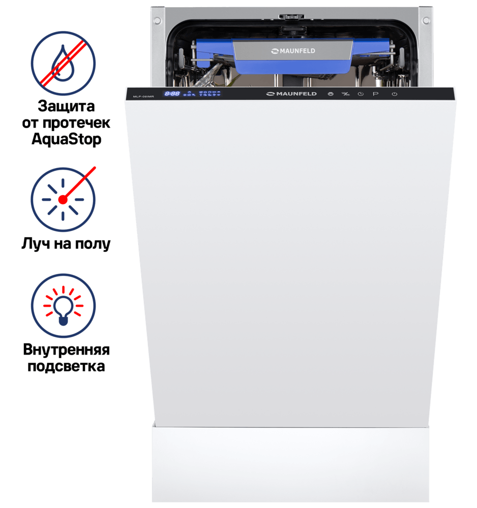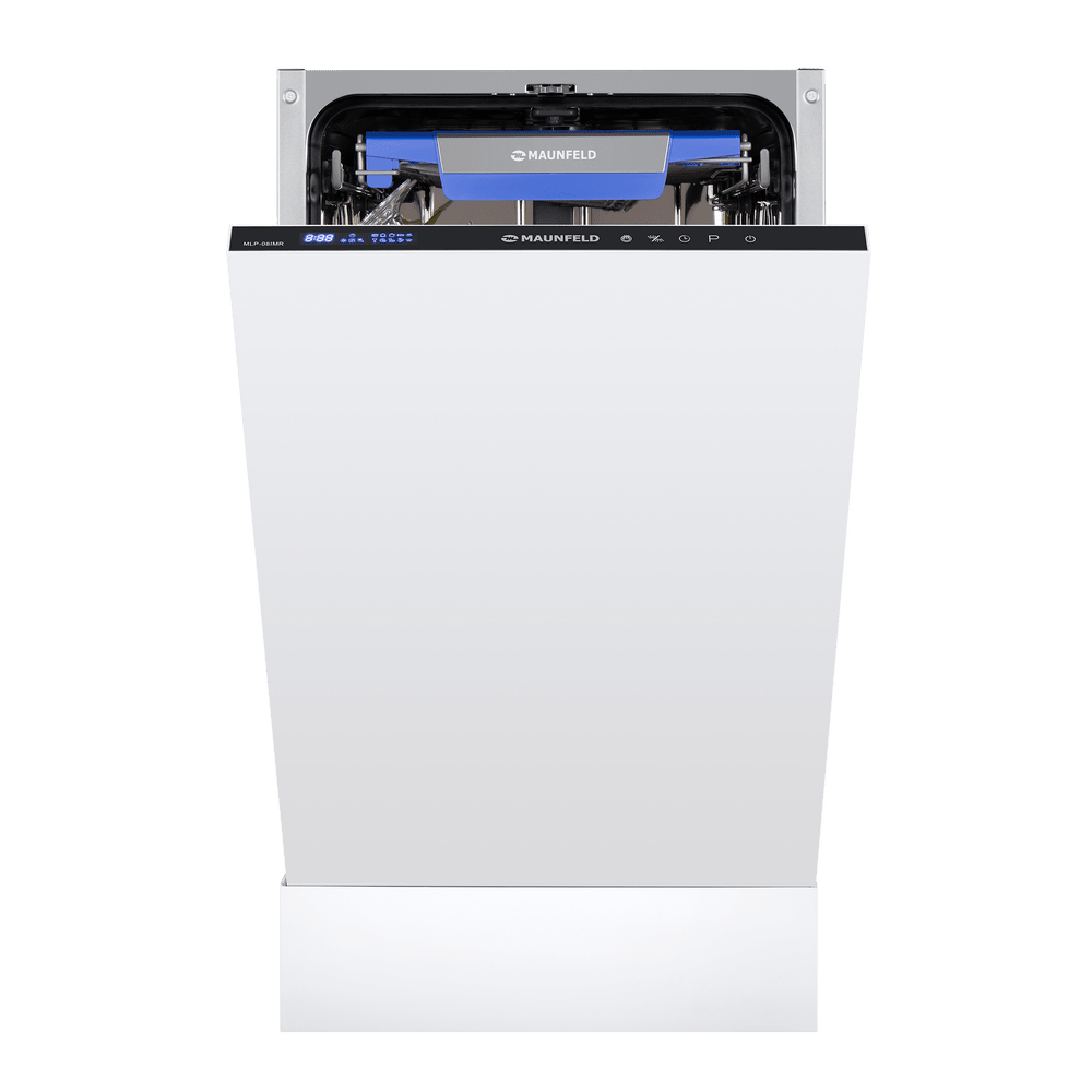 Узкая встраиваемая посудомоечная машина MAUNFELD MLP-08IMR бережно экономит место на кухне: корпус шириной 45 см легко вписывается в стандартный шкаф, а фасад остается аккуратным и цельным.