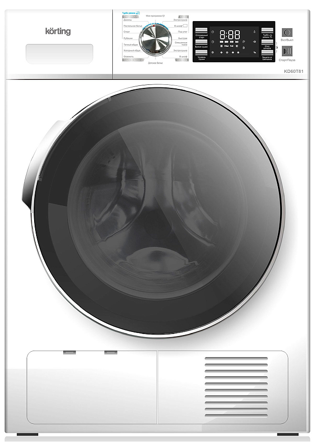 Электронное управление позволяет создать и сохранить собственную программу, в которой будут учтены температура, количество оборотов и некоторые дополнительные параметры. Это можно сделать в режиме «Моя программа». Сушильная машина Кортинг KD 60T81 защищена от случайного сбоя программы блокировкой панели. При запуске выбранного режима дисплей блокируется, и активной остается только кнопка «Выключение». Предусмотрена функция «Отложенный старт», благодаря которой можно запустить сушку в любой момент в диапазоне 24 часов.