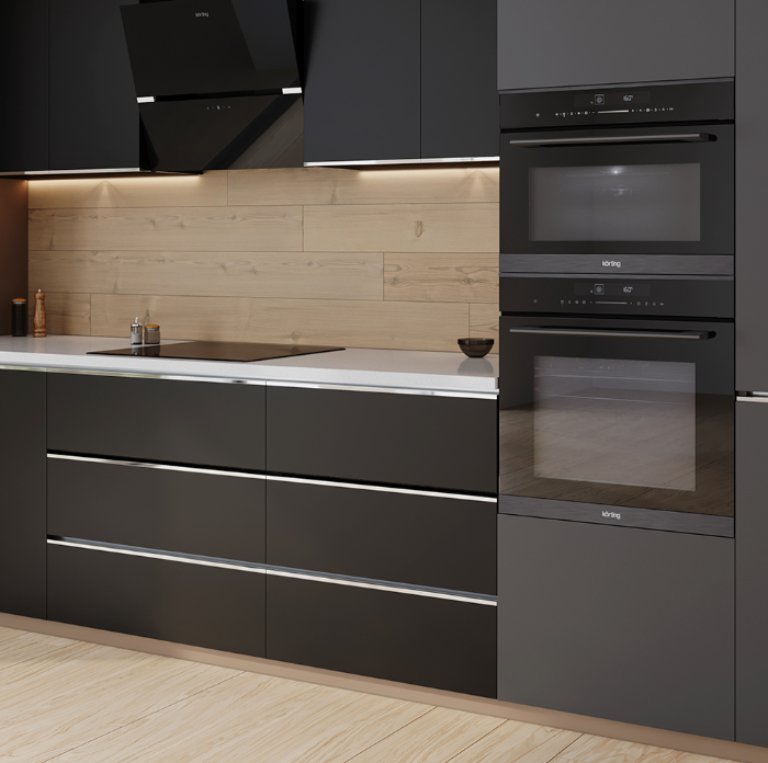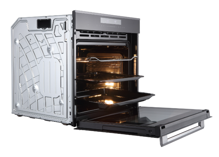 Технологии шкафа заботятся о комфорте и безопасности. Тройное остекление дверцы удерживает тепло внутри, экономя энергию и делая внешнюю поверхность безопасной для прикосновения. Доводчик дверцы обеспечивает плавное и тихое закрывание. Система автоматического охлаждения защищает кухонный гарнитур от перегрева, циркулируя холодный воздух вдоль боковых стенок.